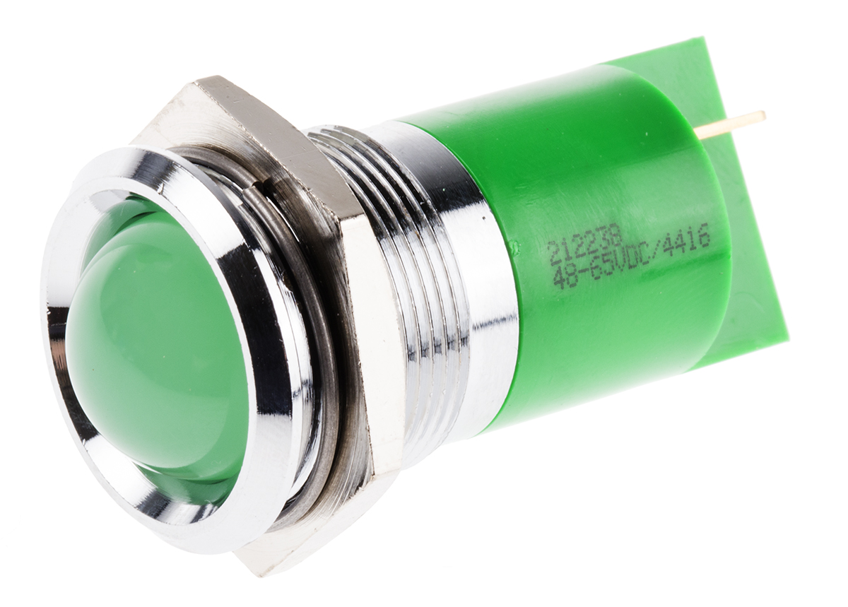 RS PRO Зеленый светодиодный индикатор панели, 48 → 65 В постоянного тока, приподнятый, вырез 22 мм
