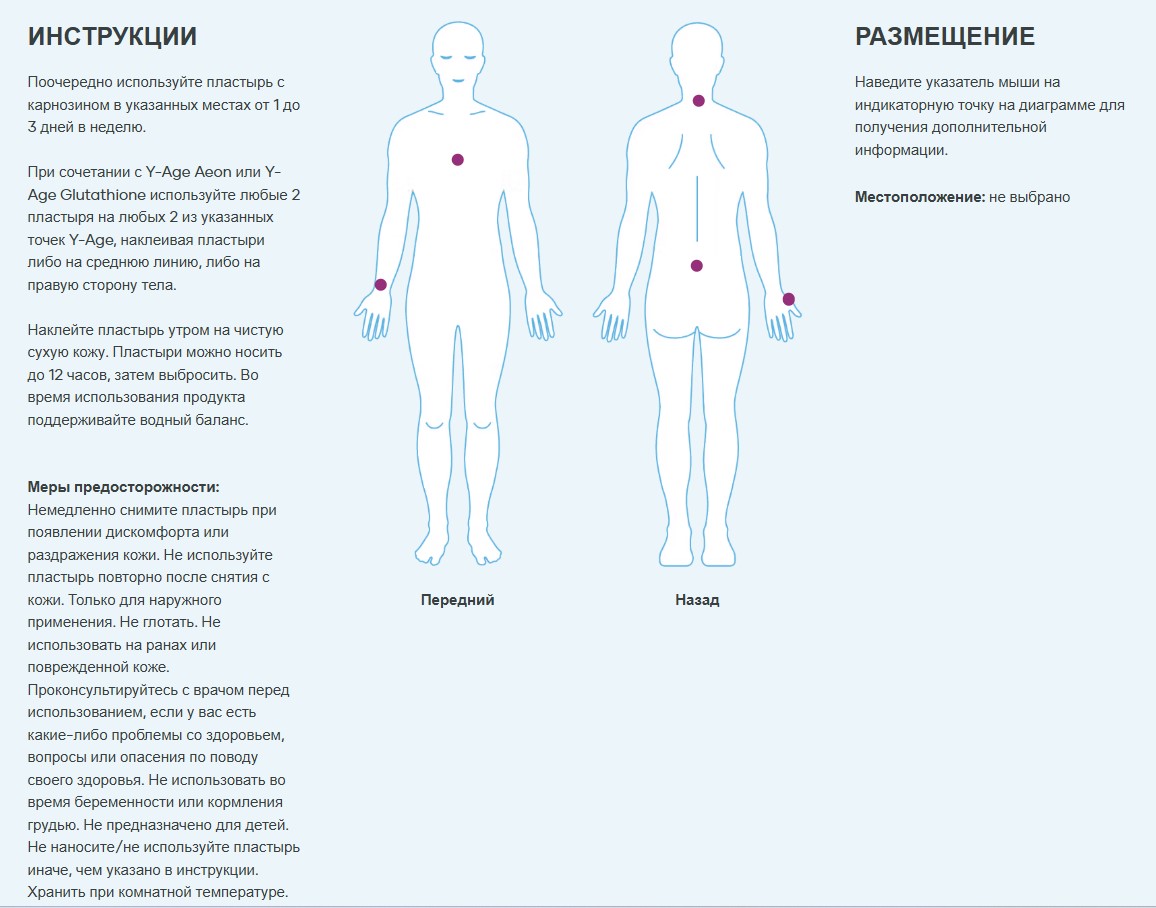 Нанесите пластырь LifeWave Y-Age Carnosine на одно из указанных мест на теле. Всегда наносите пластыри утром на чистую и сухую кожу. Пластыри LifeWave Y-Age Carnosine можно использовать на коже до 12 часов. Затем, пожалуйста, снимите и выбросьте.