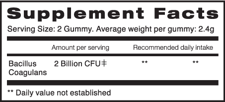 PNKids’ Probiotics gummies contain Bacillus Coagulans, a unique, strain of spore-form bacteria which is naturally dormant that can withstand many conditions such as heat, pressure, and extreme acid or alkaline conditions, any of which may usually kill bacteria cells. Because of this, it is dormant in the bottle, then reverts to a growing bacteria in the intestines, resisting being killed by stomach acid.
